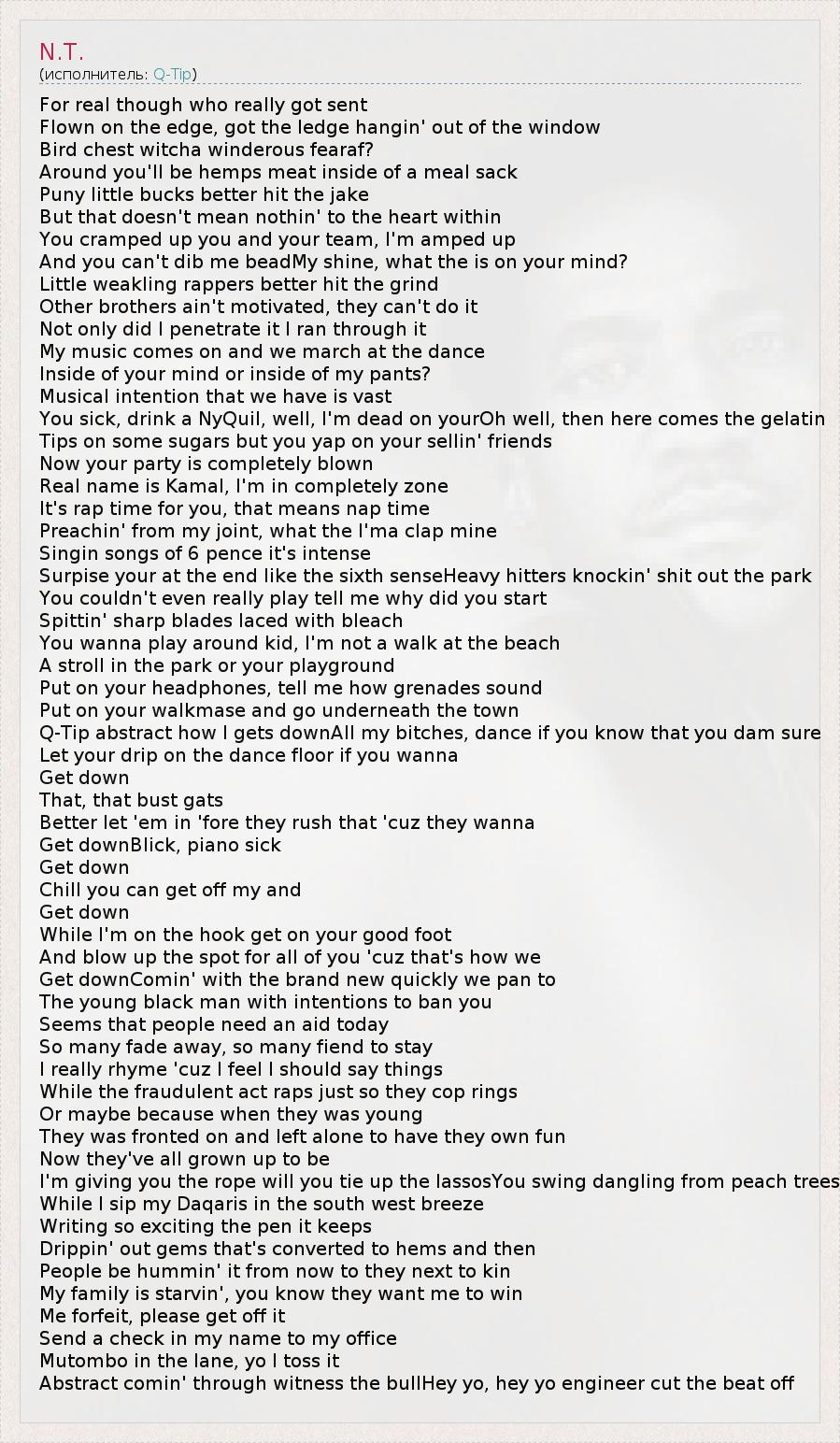 Это интересно:Q-Tip – известный американский рэпер, продюсер, актер, прославившийся во время работы в группе A Tribe Called Quest. Он родился в Нью-Йорке 10 апреля 1970 года. Имя Джонатан Дэйвис, данное ему при рождении, Q-Tip сменил на Камаль Фарид после обращения в ислам в середине девяностых. Со своим другом детства, Маликом Тэйлором, он сформировал легендарный рэп-коллектив A Tribe Called Quest, в составе которого также закрепился... продолжение