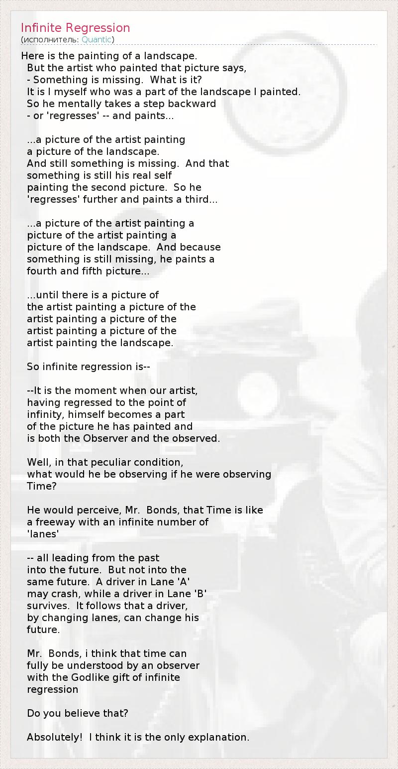 А как ты думаешь, о чем песня "Infinite Regression" ?