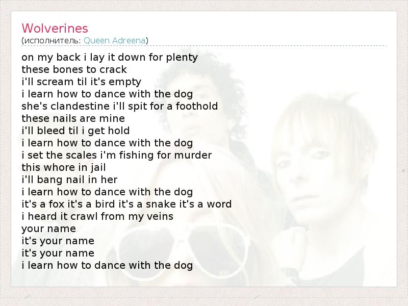on my back i lay it down for plenty these bones to crack i'll scream til it's empty i learn how to dance with the dog she's clandestine i'll spit for a foothold these nails are mine i'll bleed til i get hold i learn how to dance with the dog i set the scales i'm fishing for murder this whore in jail i'll bang nail in her i learn how to dance with the dog it's a fox it's a bird it's a snake it's a word i heard it crawl from my veins your name it's your name it's your name i learn how to dance with the dog