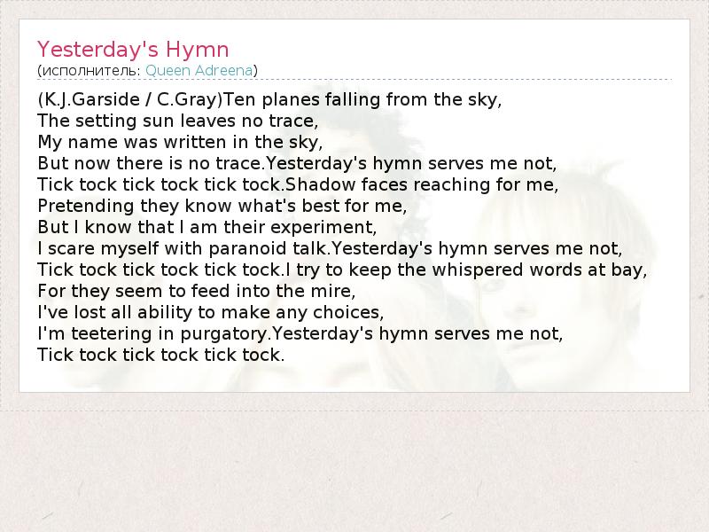 А как ты думаешь, о чем песня "Yesterday's Hymn" ?