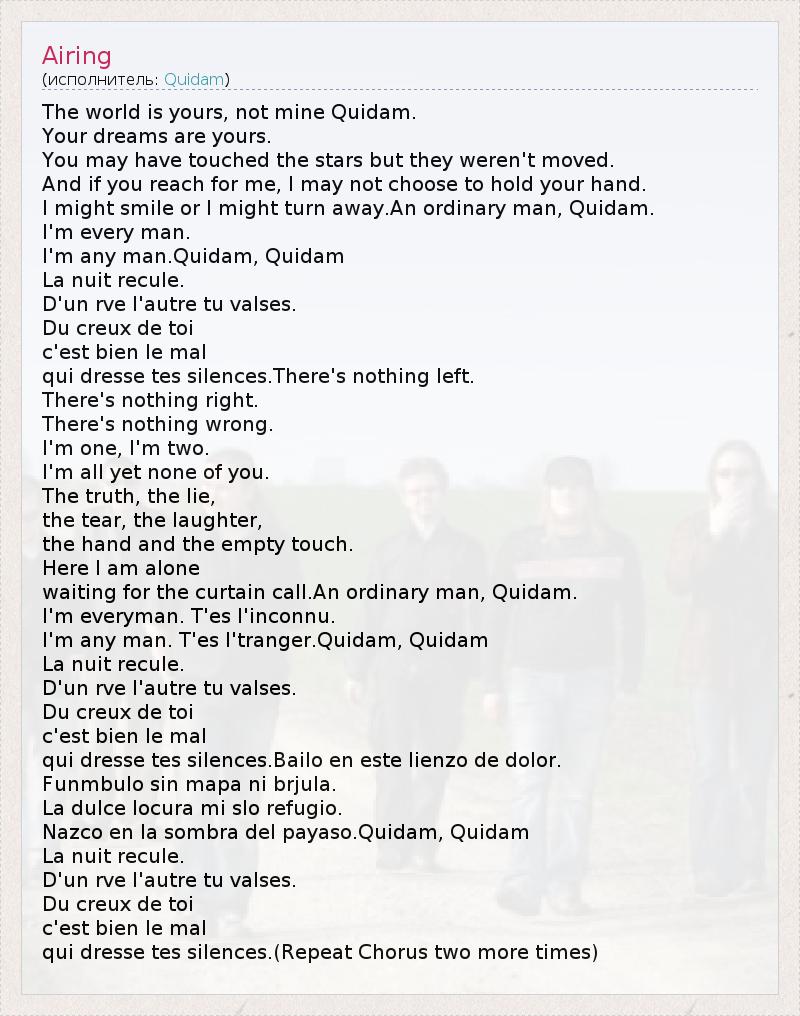 The world is yours, not mine Quidam. Your dreams are yours. You may have touched the stars but they weren't moved. And if you reach for me, I may not choose to hold your hand. I might smile or I might turn away.An ordinary man, Quidam. I'm every man. I'm any man.Quidam, Quidam La nuit recule. D'un rve l'autre tu valses. Du creux de toi c'est bien le mal qui dresse tes silences.There's nothing left. There's nothing right. There's nothing wrong. I'm one, I'm two. I'm all yet none of you. The truth, the lie, the tear, the laughter, the hand and the empty touch. Here I am alone waiting for the curtain call.An ordinary man, Quidam. I'm everyman. T'es l'inconnu. I'm any man. T'es l'tranger.Quidam, Quidam La nuit recule. D'un rve l'autre tu valses. Du creux de toi c'est bien le mal qui dresse tes silences.Bailo en este lienzo de dolor. Funmbulo sin mapa ni brjula. La dulce locura mi slo refugio. Nazco en la sombra del payaso.Quidam, Quidam La nuit recule. D'un rve l'autre tu valses. Du creux de toi c'est bien le mal qui dresse tes silences.(Repeat Chorus two more times)