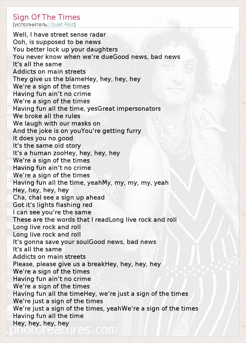 Well, I have street sense radar Ooh, is supposed to be news You better lock up your daughters You never know when we're dueGood news, bad news It's all the same Addicts on main streets They give us the blameHey, hey, hey, hey We're a sign of the times Having fun ain't no crime We're a sign of the times Having fun all the time, yesGreat impersonators We broke all the rules We laugh with our masks on And the joke is on youYou're getting furry It does you no good It's the same old story It's a human zooHey, hey, hey, hey We're a sign of the times Having fun ain't no crime We're a sign of the times Having fun all the time, yeahMy, my, my, my, yeah Hey, hey, hey, hey Cha, chaI see a sign up ahead Got it's lights flashing red I can see you're the same These are the words that I readLong live rock and roll Long live rock and roll Long live rock and roll It's gonna save your soulGood news, bad news It's all the same Addicts on main streets Please, please give us a breakHey, hey, hey, hey We're a sign of the times Having fun ain't no crime We're a sign of the times Having fun all the timeHey, we're just a sign of the times We're just a sign of the times We're just a sign of the times, yeahWe're a sign of the times Having fun all the time Hey, hey, hey, hey