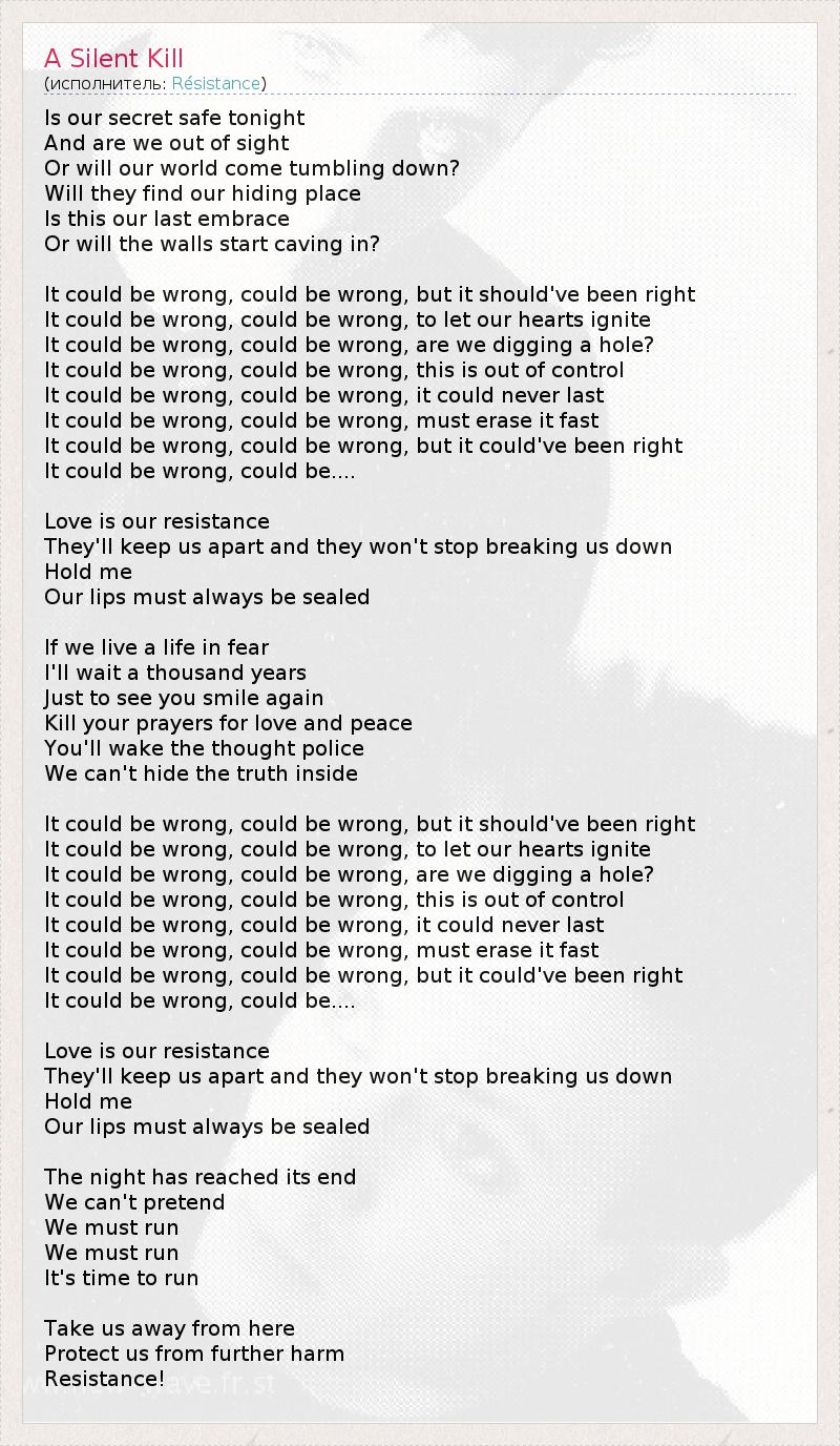Не раскроют ли наш секрет этой ночью? И действительно ли мы вне поля зрения? Или же нашему миру придет конец? Найдут ли они наше убежище? Может, это наше последние объятие? Или же стены начнут рушиться? Это могло, могло быть неправильно, но лучше было бы наоборот. Это могло, могло быть неправильно, позволить нашим сердцам зажечься. Это могло, могло быть неправильно, мы роем себе яму? Это могло, могло быть неправильно, это неподвластно нашему контролю. Это могло, могло быть неправильно, это не продлилось бы долго. Это могло, могло быть неправильно, необходимо быстро стереть это. Это могло, могло быть неправильно, а могло быть и наоборот... Это могло, могло быть неправильно... Любовь - вот наше сопротивление! Они будут держать нас порознь и не прекратят ломать нас. Держи меня! Наши губы должны всегда быть сомкнуты. Живя в страхе, Я буду ждать тысячу лет, Просто чтобы увидеть твою улыбку. Прекрати молиться ради любви и мира: Ты разбудишь стражей мысли, И мы не сможем спрятать правду внутри себя. Это могло, могло быть неправильно, но лучше было бы наоборот. Это могло, могло быть неправильно, позволить нашим сердцам зажечься. Это могло, могло быть неправильно, мы роем себе яму? Это могло, могло быть неправильно, это неподвластно нашему контролю. Это могло, могло быть неправильно, это не продлилось бы долго. Это могло, могло быть неправильно, необходимо быстро стереть это. Это могло, могло быть неправильно, а могло быть и наоборот... Это могло, могло быть неправильно... Любовь - вот наше сопротивление! Они будут держать нас порознь и не прекратят ломать нас. Держи меня! Наши губы должны всегда быть сомкнуты. Ночь кончается. Мы не можем притворяться, Мы должны бежать, Мы должны бежать. Время бежать! Забери нас подальше отсюда! Защити нас от дальнейших страданий! Сопротивляйся!