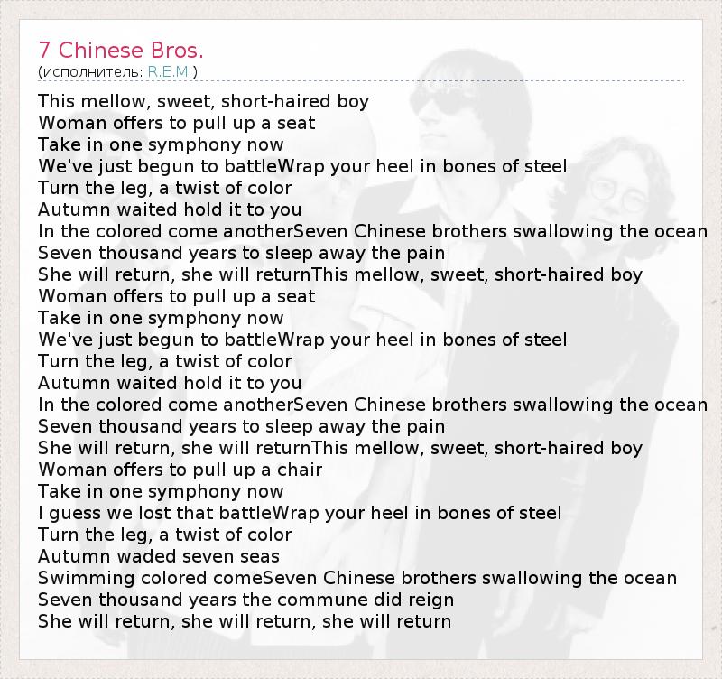 This mellow, sweet, short-haired boy Woman offers to pull up a seat Take in one symphony now We've just begun to battleWrap your heel in bones of steel Turn the leg, a twist of color Autumn waited hold it to you In the colored come anotherSeven Chinese brothers swallowing the ocean Seven thousand years to sleep away the pain She will return, she will returnThis mellow, sweet, short-haired boy Woman offers to pull up a seat Take in one symphony now We've just begun to battleWrap your heel in bones of steel Turn the leg, a twist of color Autumn waited hold it to you In the colored come anotherSeven Chinese brothers swallowing the ocean Seven thousand years to sleep away the pain She will return, she will returnThis mellow, sweet, short-haired boy Woman offers to pull up a chair Take in one symphony now I guess we lost that battleWrap your heel in bones of steel Turn the leg, a twist of color Autumn waded seven seas Swimming colored comeSeven Chinese brothers swallowing the ocean Seven thousand years the commune did reign She will return, she will return, she will return