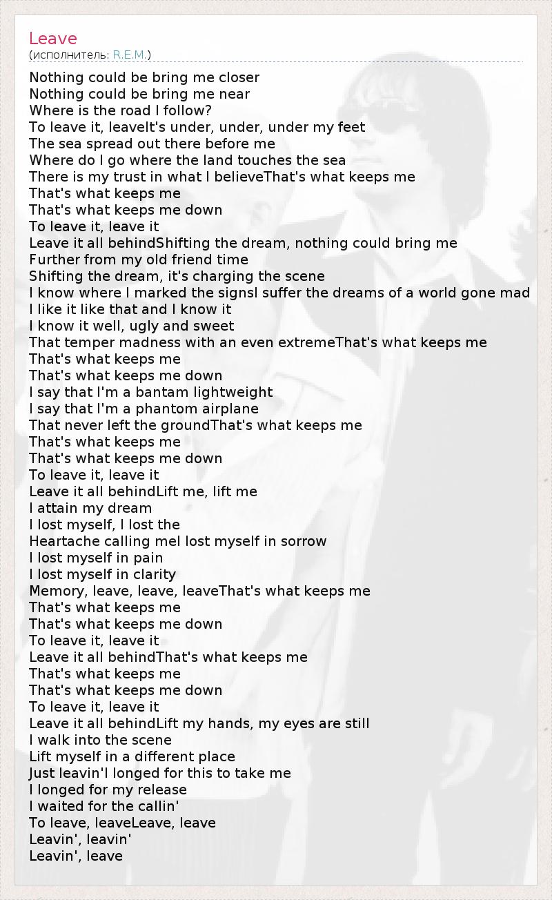 Это интересно:Свой первый концерт «R.E.M.» отыграли в американском городишке Атенс, штат Джорджия, 19 апреля 1980 года. В состав группы входили четверо выгнанных из университета парней: Майкл Стайп (р. 4 января 1960, Декатер, США; вокал), Питер Бак (р. 6 декабря 1956, Беркли, США; гитара), Майк Миллс (р. 17 декабря 1958, Оранж Каунти, США; бас) и Билл Берри (р. 31 июля 1958, Далат, США; ударные). Приобретя неплохую популярность... продолжение
