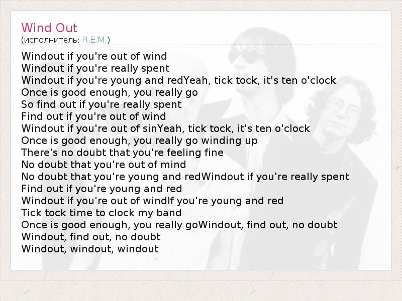 Windout if you're out of wind Windout if you're really spent Windout if you're young and redYeah, tick tock, it's ten o'clock Once is good enough, you really go So find out if you're really spent Find out if you're out of wind Windout if you're out of sinYeah, tick tock, it's ten o'clock Once is good enough, you really go winding up There's no doubt that you're feeling fine No doubt that you're out of mind No doubt that you're young and redWindout if you're really spent Find out if you're young and red Windout if you're out of windIf you're young and red Tick tock time to clock my band Once is good enough, you really goWindout, find out, no doubt Windout, find out, no doubt Windout, windout, windout