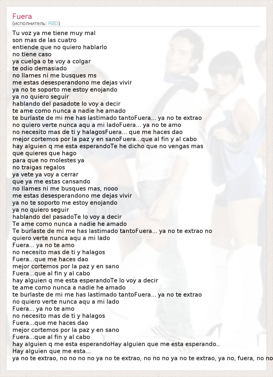 Tu voz ya me tiene muy mal son mas de las cuatro entiende que no quiero hablarlo no tiene caso ya cuelga o te voy a colgar te odio demasiado no llames ni me busques ms me estas desesperandono me dejas vivir ya no te soporto me estoy enojando ya no quiero seguir hablando del pasadote lo voy a decir te ame como nunca a nadie he amado te burlaste de mi me has lastimado tantoFuera... ya no te extrao no quiero verte nunca aqu a mi ladoFuera... ya no te amo no necesito mas de ti y halagosFuera... que me haces dao mejor cortemos por la paz y en sanoFuera...que al fin y al cabo hay alguien q me esta esperandoTe he dicho que no vengas mas que quieres que hago para que no molestes ya no traigas regalos ya vete ya voy a cerrar que ya me estas cansando no llames ni me busques mas, nooo me estas desesperandono me dejas vivir ya no te soporto me estoy enojando ya no quiero seguir hablando del pasadoTe lo voy a decir Te ame como nunca a nadie he amado Te burlaste de mi me has lastimado tantoFuera... ya no te extrao no quiero verte nunca aqu a mi lado Fuera... ya no te amo no necesito mas de ti y halagos Fuera...que me haces dao mejor cortemos por la paz y en sano Fuera...que al fin y al cabo hay alguien q me esta esperandoTe lo voy a decir te ame como nunca a nadie he amado te burlaste de mi me has lastimado tantoFuera... ya no te extrao no quiero verte nunca aqu a mi lado Fuera... ya no te amo no necesito mas de ti y halagos Fuera...que me haces dao mejor cortemos por la paz y en sano Fuera...que al fin y al cabo hay alguien q me esta esperandoHay alguien que me esta esperando.. Hay alguien que me esta... ya no te extrao, no no no no ya no te extrao, no no no ya no te extrao, ya no, fuera, no no