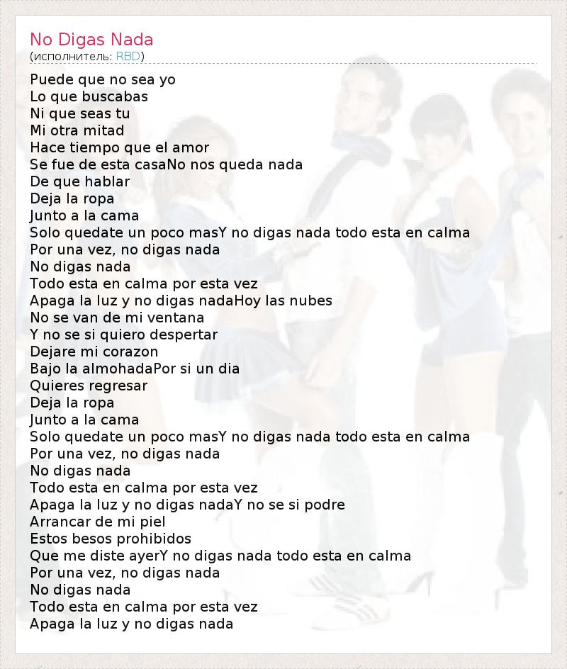 Puede que no sea yo Lo que buscabas Ni que seas tu Mi otra mitad Hace tiempo que el amor Se fue de esta casaNo nos queda nada De que hablar Deja la ropa Junto a la cama Solo quedate un poco masY no digas nada todo esta en calma Por una vez, no digas nada No digas nada Todo esta en calma por esta vez Apaga la luz y no digas nadaHoy las nubes No se van de mi ventana Y no se si quiero despertar Dejare mi corazon Bajo la almohadaPor si un dia Quieres regresar Deja la ropa Junto a la cama Solo quedate un poco masY no digas nada todo esta en calma Por una vez, no digas nada No digas nada Todo esta en calma por esta vez Apaga la luz y no digas nadaY no se si podre Arrancar de mi piel Estos besos prohibidos Que me diste ayerY no digas nada todo esta en calma Por una vez, no digas nada No digas nada Todo esta en calma por esta vez Apaga la luz y no digas nada