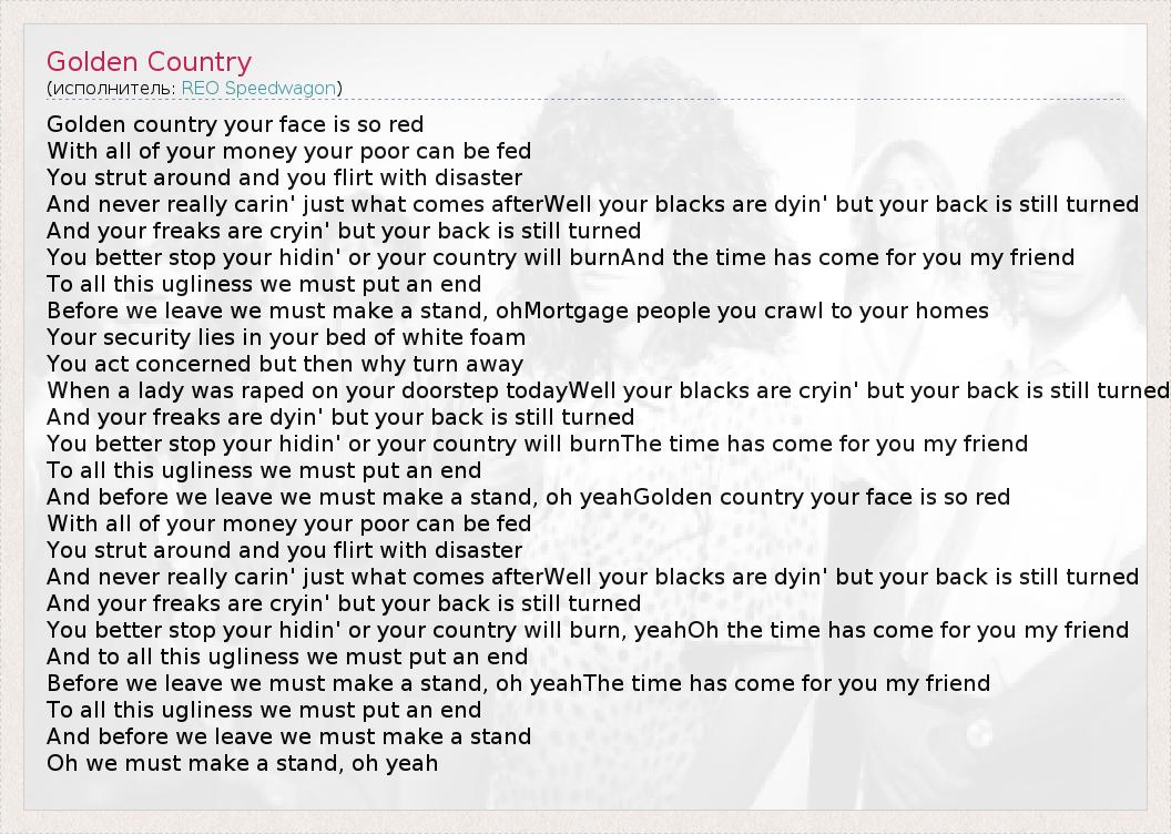 And before we leave we must make a stand, oh yeahGolden country your face is so red