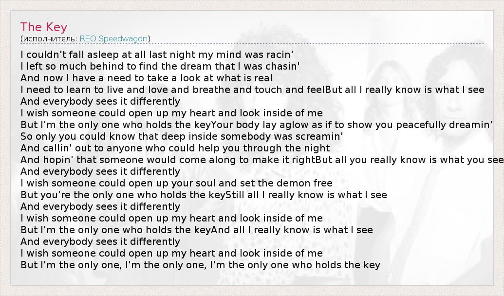 Это интересно:Группа "REO Speedwagon" была основана в далеком 1968 году двумя студентами Иллинойского Университета, Нилом Даути (клавишные) и Аланом Гратцером (ударные). По окончании вуза парни познакомились с неизвестным тогда еще менеджером Ирвином Азоффом (впоследствии прославившимся своей работой с "Eagles" и "Steely Dan"), который организовал первые гастроли команды по Среднему Западу. В начале... продолжение