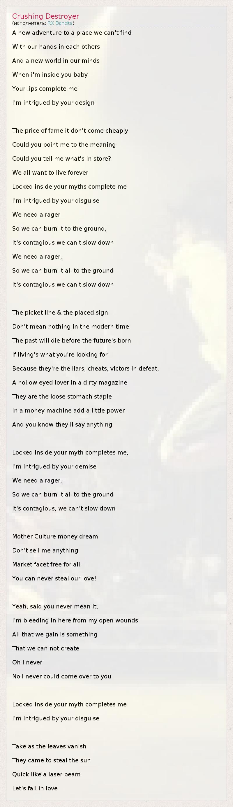 A new adventure to a place we can't find With our hands in each others And a new world in our minds When i'm inside you baby Your lips complete me I'm intrigued by your design The price of fame it don't come cheaply Could you point me to the meaning Could you tell me what's in store? We all want to live forever Locked inside your myths complete me I'm intrigued by your disguise We need a rager So we can burn it to the ground, It's contagious we can't slow down We need a rager, So we can burn it all to the ground It's contagious we can't slow down The picket line & the placed sign Don't mean nothing in the modern time The past will die before the future's born If living's what you're looking for Because they're the liars, cheats, victors in defeat, A hollow eyed lover in a dirty magazine They are the loose stomach staple In a money machine add a little power And you know they'll say anything Locked inside your myth completes me, I'm intrigued by your demise We need a rager, So we can burn it all to the ground It's contagious, we can't slow down Mother Culture money dream Don't sell me anything Market facet free for all You can never steal our love! Yeah, said you never mean it, I'm bleeding in here from my open wounds All that we gain is something That we can not create Oh I never No I never could come over to you Locked inside your myth completes me I'm intrigued by your disguise Take as the leaves vanish They came to steal the sun Quick like a laser beam Let's fall in love
