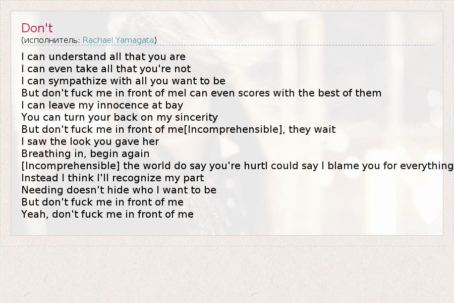 I can understand all that you are I can even take all that you're not I can sympathize with all you want to be But don't fuck me in front of meI can even scores with the best of them I can leave my innocence at bay You can turn your back on my sincerity But don't fuck me in front of me[Incomprehensible], they wait I saw the look you gave her Breathing in, begin again [Incomprehensible] the world do say you're hurtI could say I blame you for everything Instead I think I'll recognize my part Needing doesn't hide who I want to be But don't fuck me in front of me Yeah, don't fuck me in front of me