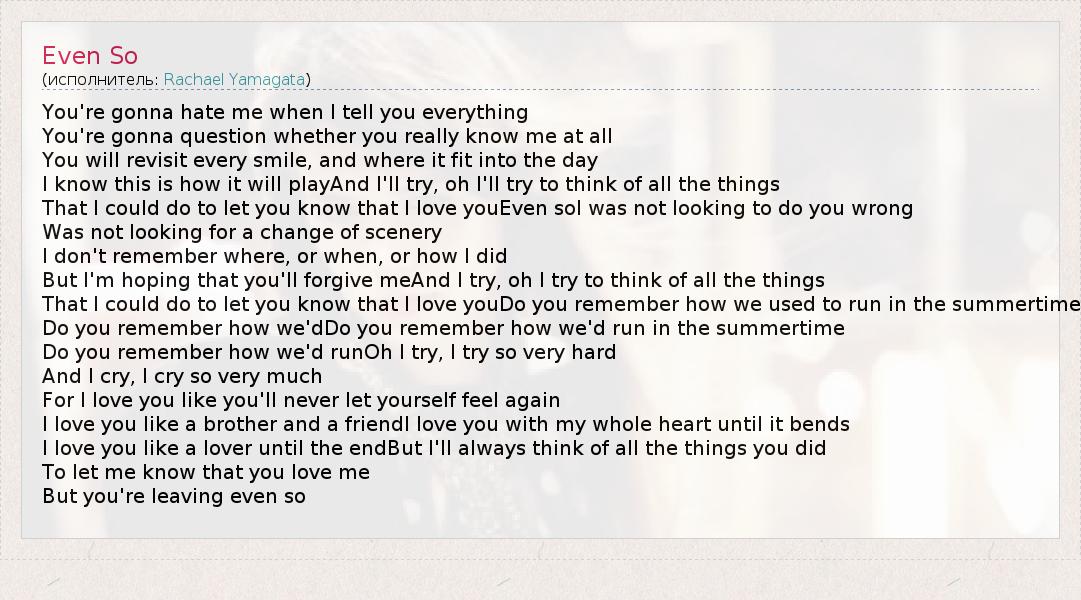 Это интересно:Женский рок-вокал для разборчивых. Рэйчел Ямагата некогда работала вокалисткой малоизвестной бостонской джаз-группы Bumpus. Свой первый сольный релиз, мини-альбом из пяти песен "ЕР", она выпустила в 2003 году. В тех вещах еще были заметны джазовые нотки, но теперь Рэйчел, можно сказать, нащупала свой стиль, пополнив немногочисленную и прекрасную обойму американских интеллектуалок, производящих... продолжение