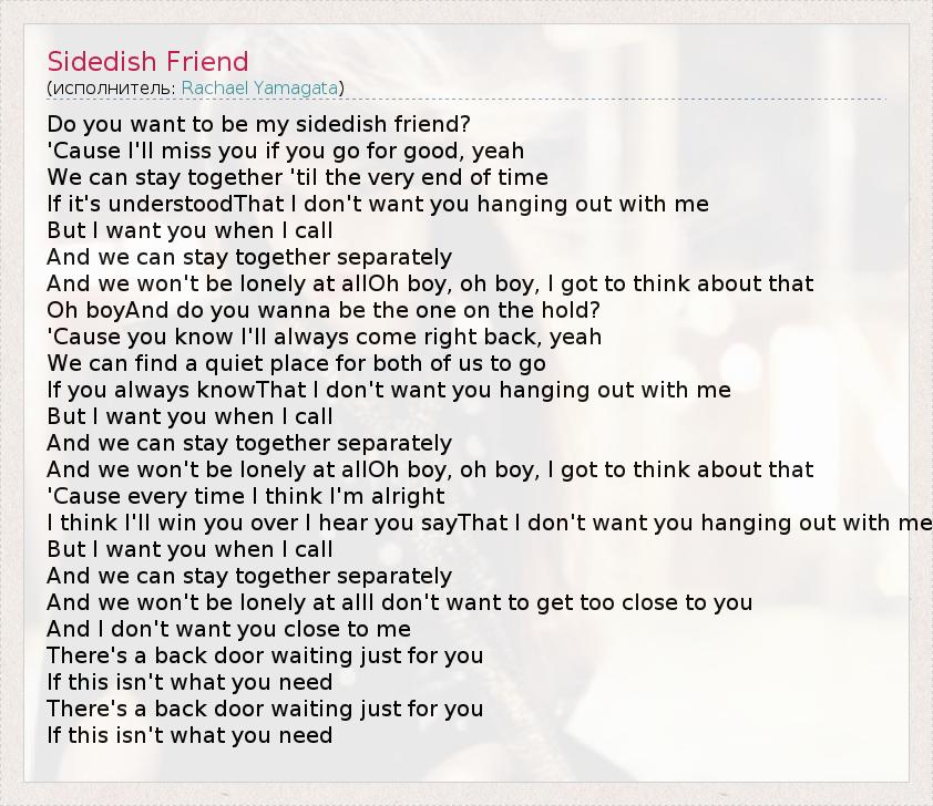 А как ты думаешь, о чем песня "Sidedish Friend" ?
