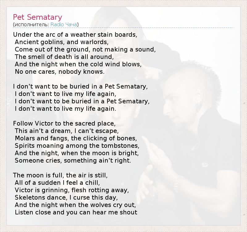 Кладбище домашних животных Под сводом погоды правит тьма Древние гоблины и боги войны Восстаньте из земли, не издавая ни звука Запах смерти повсюду И ночи проходят, и холодный ветер дует Никому нет дела и никто не знает Я не хочу быть похороненным на кладбище домашних животных Я не хочу прожить мою жизнь снова Я последую за Виктором в священное место Там нет ни одного сна, от которого я мог бы спастись Зубы и клыки, и лязганье костей Души стонут среди надгробных камней Когда приходит ночь и ярко светит луна Кто-то кричит и что-то не так Я не хочу быть похороненным на кладбище домашних животных Я не хочу прожить мою жизнь снова О, нет Луна полная, воздух тих Вдруг я чувствую холод Виктор скалит зубы, плоть гниёт Скелеты танцуют, я проклинаю этот день И в ночь, когда завоют волки Слушай внимательно и ты услышишь мой крик Я не хочу быть похороненным на кладбище домашних животных Я не хочу прожить мою жизнь снова О, нет
