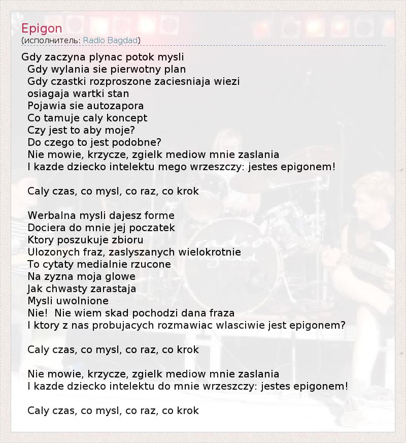Gdy zaczyna plynac potok mysli Gdy wylania sie pierwotny plan Gdy czastki rozproszone zaciesniaja wiezi osiagaja wartki stan Pojawia sie autozapora Co tamuje caly koncept Czy jest to aby moje? Do czego to jest podobne? Nie mowie, krzycze, zgielk mediow mnie zaslania I kazde dziecko intelektu mego wrzeszczy: jestes epigonem! Caly czas, co mysl, co raz, co krok Werbalna mysli dajesz forme Dociera do mnie jej poczatek Ktory poszukuje zbioru Ulozonych fraz, zaslyszanych wielokrotnie To cytaty medialnie rzucone Na zyzna moja glowe Jak chwasty zarastaja Mysli uwolnione Nie! Nie wiem skad pochodzi dana fraza I ktory z nas probujacych rozmawiac wlasciwie jest epigonem? Caly czas, co mysl, co raz, co krok Nie mowie, krzycze, zgielk mediow mnie zaslania I kazde dziecko intelektu do mnie wrzeszczy: jestes epigonem! Caly czas, co mysl, co raz, co krok