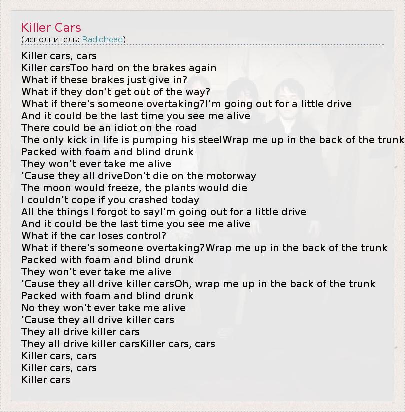 А как ты думаешь, о чем песня "Killer Cars" ?