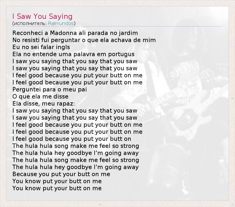 Reconheci a Madonna ali parada no jardim No resisti fui perguntar o que ela achava de mim Eu no sei falar ingls Ela no entende uma palavra em portugus I saw you saying that you say that you saw I saw you saying that you say that you saw I feel good because you put your butt on me I feel good because you put your butt on me Perguntei para o meu pai O que ela me disse Ela disse, meu rapaz: I saw you saying that you say that you saw I saw you saying that you say that you saw I feel good because you put your butt on me I feel good because you put your butt on me I feel good because you put your butt on The hula hula song make me feel so strong The hula hula hey goodbye I'm going away The hula hula song make me feel so strong The hula hula hey goodbye I'm going away Because you put your butt on me You know put your butt on me You know put your butt on me