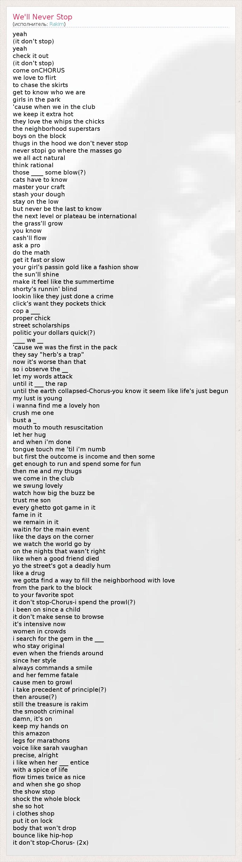 yeah (it don't stop) yeah check it out (it don't stop) come onCHORUS we love to flirt to chase the skirts get to know who we are girls in the park 'cause when we in the club we keep it extra hot they love the whips the chicks the neighborhood superstars boys on the block thugs in the hood we don't never stop never stopi go where the masses go we all act natural think rational those ____ some blow(?) cats have to know master your craft stash your dough stay on the low but never be the last to know the next level or plateau be international the grass'll grow you know cash'll flow ask a pro do the math get it fast or slow your girl's passin gold like a fashion show the sun'll shine make it feel like the summertime shorty's runnin' blind lookin like they just done a crime click's want they pockets thick cop a ___ proper chick street scholarships politic your dollars quick(?) ____ we __ 'cause we was the first in the pack they say "herb's a trap" now it's worse than that so i observe the __ let my words attack until it ___ the rap until the earth collapsed-Chorus-you know it seem like life's just begun my lust is young i wanna find me a lovely hon crush me one bust a _ mouth to mouth resuscitation let her hug and when i'm done tongue touch me 'til i'm numb but first the outcome is income and then some get enough to run and spend some for fun then me and my thugs we come in the club we swung lovely watch how big the buzz be trust me son every ghetto got game in it fame in it we remain in it waitin for the main event like the days on the corner we watch the world go by on the nights that wasn't right like when a good friend died yo the street's got a deadly hum like a drug we gotta find a way to fill the neighborhood with love from the park to the block to your favorite spot it don't stop-Chorus-i spend the prowl(?) i been on since a child it don't make sense to browse it's intensive now women in crowds i search for the gem in the ___ who stay original even when the friends around since her style always commands a smile and her femme fatale cause men to growl i take precedent of principle(?) then arouse(?) still the treasure is rakim the smooth criminal damn, it's on keep my hands on this amazon legs for marathons voice like sarah vaughan precise, alright i like when her ___ entice with a spice of life flow times twice as nice and when she go shop the show stop shock the whole block she so hot i clothes shop put it on lock body that won't drop bounce like hip-hop it don't stop-Chorus- (2x)