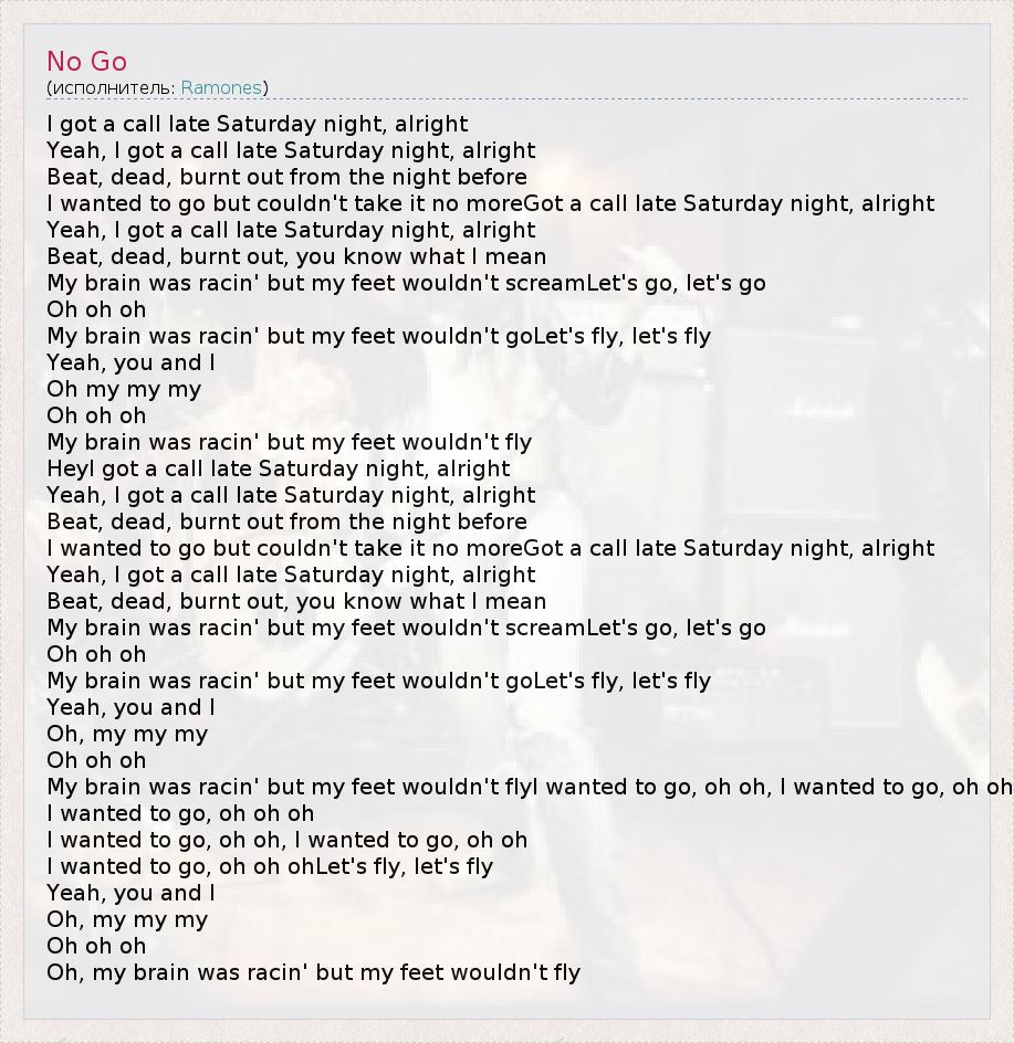 I got a call late Saturday night, alright Yeah, I got a call late Saturday night, alright Beat, dead, burnt out from the night before I wanted to go but couldn't take it no moreGot a call late Saturday night, alright Yeah, I got a call late Saturday night, alright Beat, dead, burnt out, you know what I mean My brain was racin' but my feet wouldn't screamLet's go, let's go Oh oh oh My brain was racin' but my feet wouldn't goLet's fly, let's fly Yeah, you and I Oh my my my Oh oh oh My brain was racin' but my feet wouldn't fly HeyI got a call late Saturday night, alright Yeah, I got a call late Saturday night, alright Beat, dead, burnt out from the night before I wanted to go but couldn't take it no moreGot a call late Saturday night, alright Yeah, I got a call late Saturday night, alright Beat, dead, burnt out, you know what I mean My brain was racin' but my feet wouldn't screamLet's go, let's go Oh oh oh My brain was racin' but my feet wouldn't goLet's fly, let's fly Yeah, you and I Oh, my my my Oh oh oh My brain was racin' but my feet wouldn't flyI wanted to go, oh oh, I wanted to go, oh oh I wanted to go, oh oh oh I wanted to go, oh oh, I wanted to go, oh oh I wanted to go, oh oh ohLet's fly, let's fly Yeah, you and I Oh, my my my Oh oh oh Oh, my brain was racin' but my feet wouldn't fly