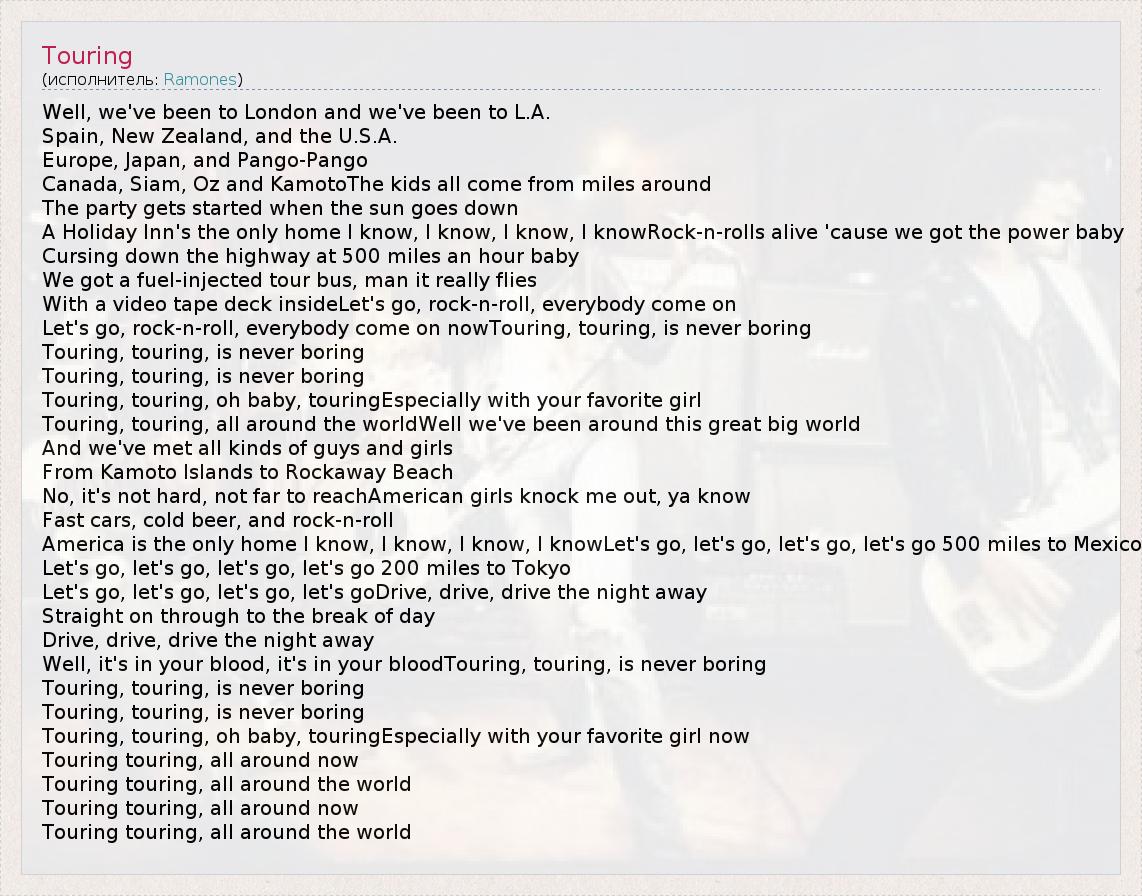 Let's go, rock-n-roll, everybody come on nowTouring, touring, is never boring