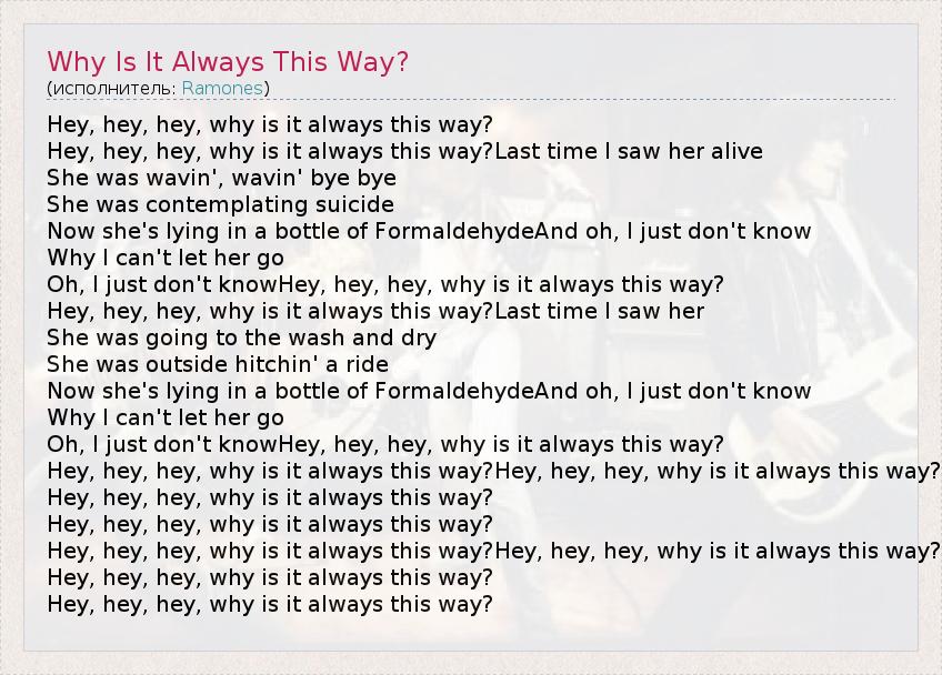 А как ты думаешь, о чем песня "Why Is It Always This Way?" ?