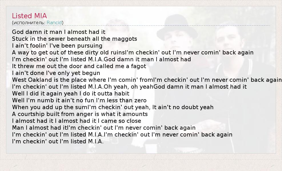 I'm checkin' out I'm listed M.I.A.God damn it man I almost had