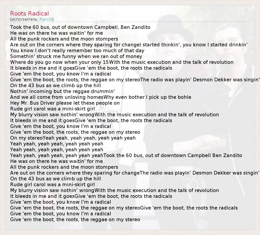 Took the 60 bus, out of downtown Campbell, Ben Zandito He was on there he was waitin' for me All the punk rockers and the moon stompers Are out on the corners where they sparing for changeI started thinkin', you know I started drinkin' You know I don't really remember too much of that day Somethin' struck me funny when we ran out of money Where do you go now when your only 15With the music execution and the talk of revolution It bleeds in me and it goesGive 'em the boot, the roots the radicals Give 'em the boot, you know I'm a radical Give 'em the boot, the roots, the reggae on my stereoThe radio was playin' Desmon Dekker was singin' On the 43 bus as we climb up the hill Nothin' incoming but the reggae drummin' And we all come from unloving homesWhy even bother I pick up the bohle Hey Mr. Bus Driver please let these people on Rude girl carol was a mini-skirt girl My blurry vision saw nothin' wrongWith the music execution and the talk of revolution It bleeds in me and it goesGive 'em the boot, the roots the radicals Give 'em the boot, you know I'm a radical Give 'em the boot, the roots, the reggae on my stereo On my stereoYeah yeah, yeah yeah, yeah yeah yeah Yeah yeah, yeah yeah, yeah yeah yeah Yeah yeah, yeah yeah, yeah yeah yeah Yeah yeah, yeah yeah, yeah yeah yeahTook the 60 bus, out of downtown Campbell Ben Zandito He was on there he was waitin' for me All the punk rockers and the moon stompers Are out on the corners where they sparing for changeThe radio was playin' Desmon Dekker was singin' On the 43 bus as we climb up the hill Rude girl carol was a mini-skirt girl My blurry vision saw nothin' wrongWith the music execution and the talk of revolution It bleeds in me and it goesGive 'em the boot, the roots the radicals Give 'em the boot, you know I'm a radical Give 'em the boot, the roots, the reggae on my stereoGive 'em the boot, the roots the radicals Give 'em the boot, you know I'm a radical Give 'em the boot, the roots, the reggae on my stereo