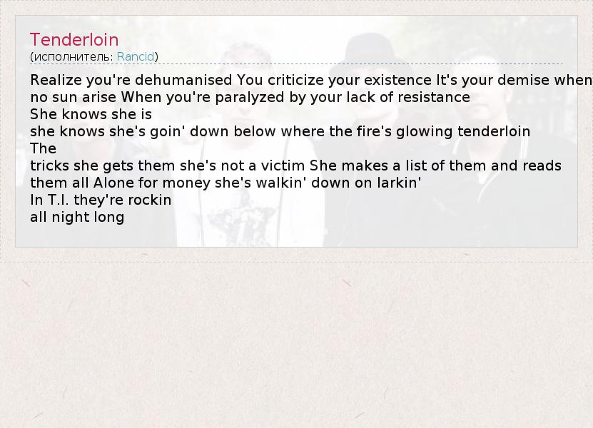А как ты думаешь, о чем песня "Tenderloin" ?