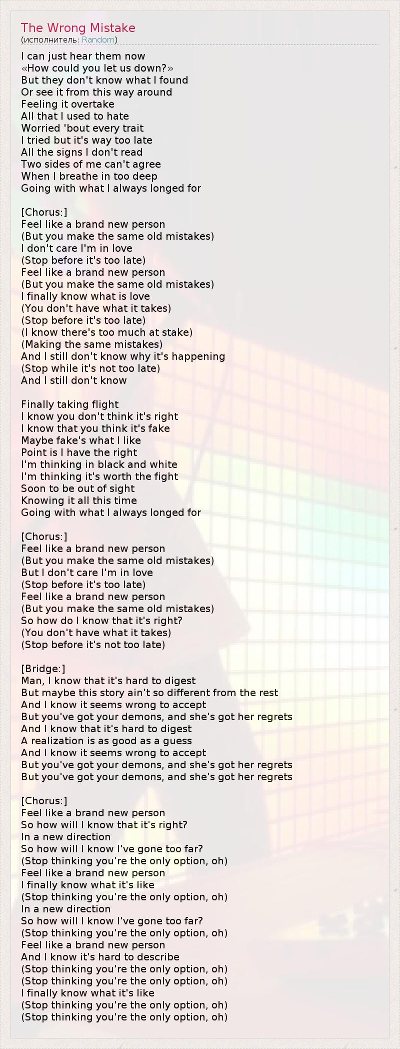 I can just hear them now «How could you let us down?» But they don't know what I found Or see it from this way around Feeling it overtake All that I used to hate Worried 'bout every trait I tried but it's way too late All the signs I don't read Two sides of me can't agree When I breathe in too deep Going with what I always longed for [Chorus:] Feel like a brand new person (But you make the same old mistakes) I don't care I'm in love (Stop before it's too late) Feel like a brand new person (But you make the same old mistakes) I finally know what is love (You don't have what it takes) (Stop before it's too late) (I know there's too much at stake) (Making the same mistakes) And I still don't know why it's happening (Stop while it's not too late) And I still don't know Finally taking flight I know you don't think it's right I know that you think it's fake Maybe fake's what I like Point is I have the right I'm thinking in black and white I'm thinking it's worth the fight Soon to be out of sight Knowing it all this time Going with what I always longed for [Chorus:] Feel like a brand new person (But you make the same old mistakes) But I don't care I'm in love (Stop before it's too late) Feel like a brand new person (But you make the same old mistakes) So how do I know that it's right? (You don't have what it takes) (Stop before it's not too late) [Bridge:] Man, I know that it's hard to digest But maybe this story ain't so different from the rest And I know it seems wrong to accept But you've got your demons, and she's got her regrets And I know that it's hard to digest A realization is as good as a guess And I know it seems wrong to accept But you've got your demons, and she's got her regrets But you've got your demons, and she's got her regrets [Chorus:] Feel like a brand new person So how will I know that it's right? In a new direction So how will I know I've gone too far? (Stop thinking you're the only option, oh) Feel like a brand new person I finally know what it's like (Stop thinking you're the only option, oh) In a new direction So how will I know I've gone too far? (Stop thinking you're the only option, oh) Feel like a brand new person And I know it's hard to describe (Stop thinking you're the only option, oh) (Stop thinking you're the only option, oh) I finally know what it's like (Stop thinking you're the only option, oh) (Stop thinking you're the only option, oh)