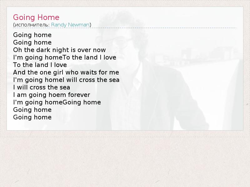 Going home Going home Oh the dark night is over now I'm going homeTo the land I love To the land I love And the one girl who waits for me I'm going homeI will cross the sea I will cross the sea I am going hoem forever I'm going homeGoing home Going home Going home