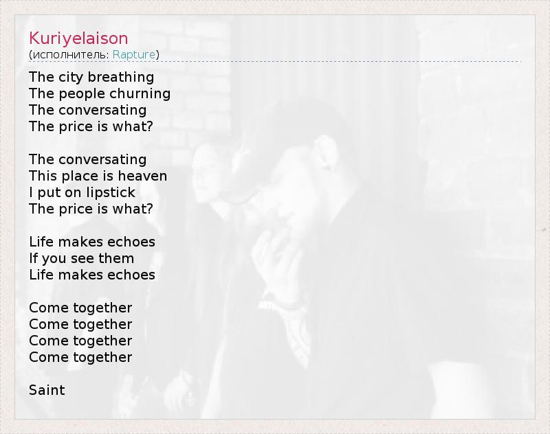 Дыхание города Вихрь людей Болтовня А какова цена? Болтовня Это место - рай Я накрвил губы помадой И какова цена? Жизнь отдается эхом Если ты их видишь Жизнь отдается эхом Объдиняйтесь Объединяйтесь