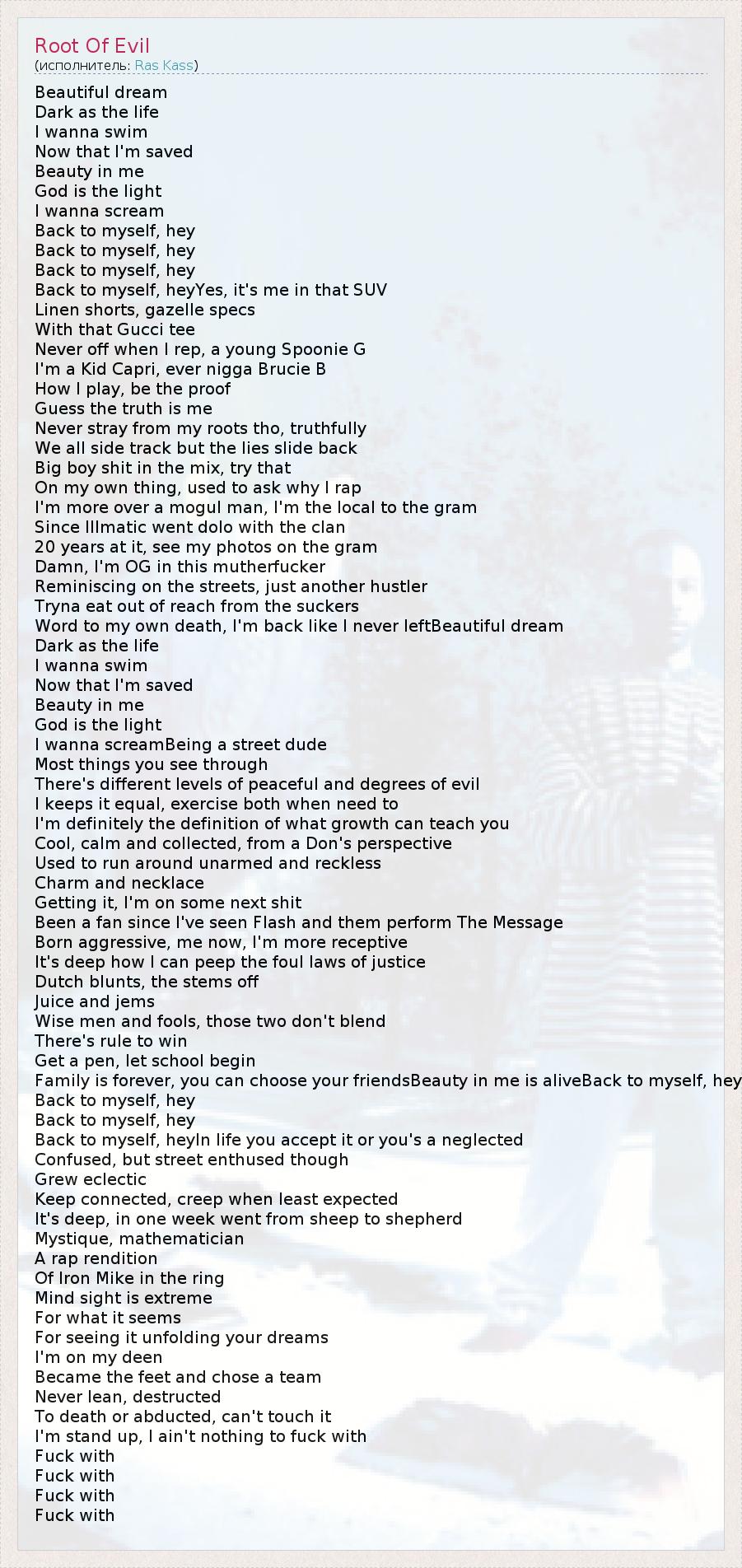 Beautiful dream Dark as the life I wanna swim Now that I'm saved Beauty in me God is the light I wanna scream Back to myself, hey Back to myself, hey Back to myself, hey Back to myself, heyYes, it's me in that SUV Linen shorts, gazelle specs With that Gucci tee Never off when I rep, a young Spoonie G I'm a Kid Capri, ever nigga Brucie B How I play, be the proof Guess the truth is me Never stray from my roots tho, truthfully We all side track but the lies slide back Big boy shit in the mix, try that On my own thing, used to ask why I rap I'm more over a mogul man, I'm the local to the gram Since Illmatic went dolo with the clan 20 years at it, see my photos on the gram Damn, I'm OG in this mutherfucker Reminiscing on the streets, just another hustler Tryna eat out of reach from the suckers Word to my own death, I'm back like I never leftBeautiful dream Dark as the life I wanna swim Now that I'm saved Beauty in me God is the light I wanna screamBeing a street dude Most things you see through There's different levels of peaceful and degrees of evil I keeps it equal, exercise both when need to I'm definitely the definition of what growth can teach you Cool, calm and collected, from a Don's perspective Used to run around unarmed and reckless Charm and necklace Getting it, I'm on some next shit Been a fan since I've seen Flash and them perform The Message Born aggressive, me now, I'm more receptive It's deep how I can peep the foul laws of justice Dutch blunts, the stems off Juice and jems Wise men and fools, those two don't blend There's rule to win Get a pen, let school begin Family is forever, you can choose your friendsBeauty in me is aliveBack to myself, hey Back to myself, hey Back to myself, hey Back to myself, heyIn life you accept it or you's a neglected Confused, but street enthused though Grew eclectic Keep connected, creep when least expected It's deep, in one week went from sheep to shepherd Mystique, mathematician A rap rendition Of Iron Mike in the ring Mind sight is extreme For what it seems For seeing it unfolding your dreams I'm on my deen Became the feet and chose a team Never lean, destructed To death or abducted, can't touch it I'm stand up, I ain't nothing to fuck with Fuck with Fuck with Fuck with Fuck with