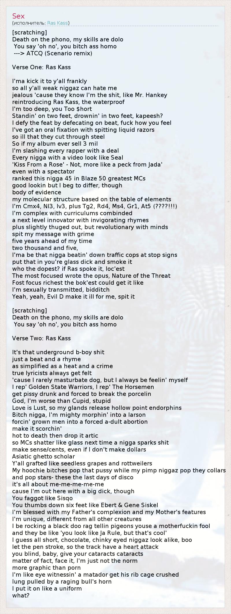 Это интересно:Джон Остин (John Austin) аka Ras Kass — один из немногих избранных афроамериканцев, которые просыпаются, когда им захочется, и которых не беспокоит вопрос, какими путями загрузить желудок, не занимая у братвы. Вот уже третий год Ras Kass ходит в балахонах по последней моде и все именуют его не иначе, как любимым сыном лос–анджелесского рэпперского андерграунда.Если Раким и Тупак — признанные боги... продолжение