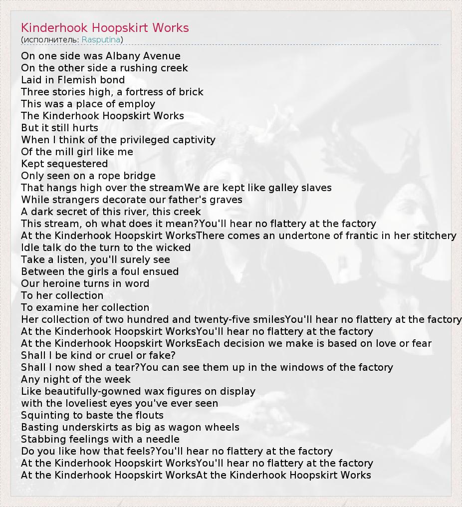 А как ты думаешь, о чем песня "Kinderhook Hoopskirt Works" ?