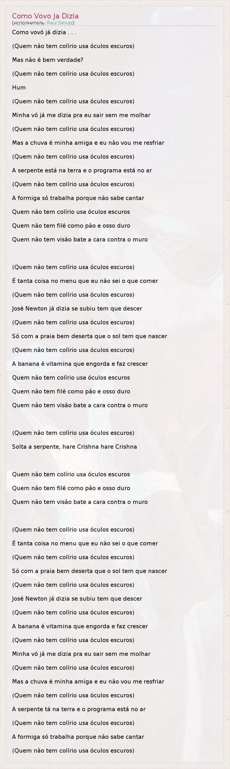 Como vovó já dizia . . . (Quem não tem colírio usa óculos escuros) Mas não é bem verdade? (Quem não tem colírio usa óculos escuros) Hum (Quem não tem colírio usa óculos escuros) Minha vó já me dizia pra eu sair sem me molhar (Quem não tem colírio usa óculos escuros) Mas a chuva é minha amiga e eu não vou me resfriar (Quem não tem colírio usa óculos escuros) A serpente está na terra e o programa está no ar (Quem não tem colírio usa óculos escuros) A formiga só trabalha porque não sabe cantar Quem não tem colírio usa óculos escuros Quem não tem filé como pão e osso duro Quem não tem visão bate a cara contra o muro (Quem não tem colírio usa óculos escuros) É tanta coisa no menu que eu não sei o que comer (Quem não tem colírio usa óculos escuros) José Newton já dizia se subiu tem que descer (Quem não tem colírio usa óculos escuros) Só com a praia bem deserta que o sol tem que nascer (Quem não tem colírio usa óculos escuros) A banana é vitamina que engorda e faz crescer Quem não tem colírio usa óculos escuros Quem não tem filé como pão e osso duro Quem não tem visão bate a cara contra o muro (Quem não tem colírio usa óculos escuros) Solta a serpente, hare Crishna hare Crishna Quem não tem colírio usa óculos escuros Quem não tem filé como pão e osso duro Quem não tem visão bate a cara contra o muro (Quem não tem colírio usa óculos escuros) É tanta coisa no menu que eu não sei o que comer (Quem não tem colírio usa óculos escuros) Só com a praia bem deserta que o sol tem que nascer (Quem não tem colírio usa óculos escuros) José Newton já dizia se subiu tem que descer (Quem não tem colírio usa óculos escuros) A banana é vitamina que engorda e faz crescer (Quem não tem colírio usa óculos escuros) Minha vó já me dizia pra eu sair sem me molhar (Quem não tem colírio usa óculos escuros) Mas a chuva é minha amiga e eu não vou me resfriar (Quem não tem colírio usa óculos escuros) A serpente tá na terra e o programa está no ar (Quem não tem colírio usa óculos escuros) A formiga só trabalha porque não sabe cantar (Quem não tem colírio usa óculos escuros)