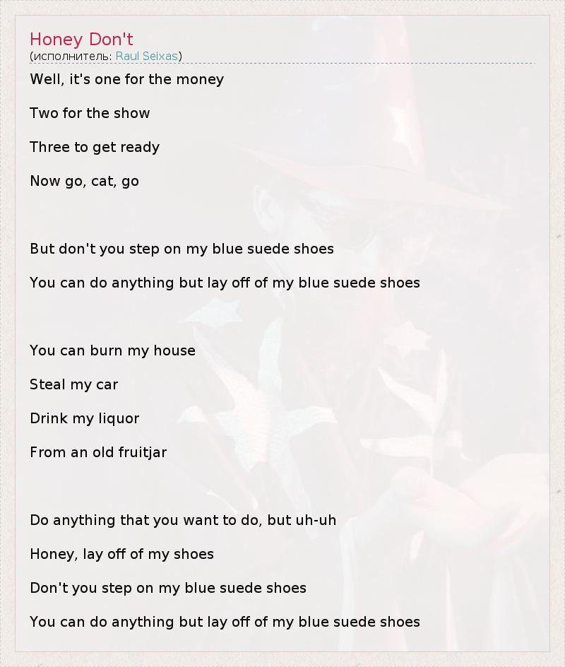Well, it's one for the money Two for the show Three to get ready Now go, cat, go But don't you step on my blue suede shoes You can do anything but lay off of my blue suede shoes You can burn my house Steal my car Drink my liquor From an old fruitjar Do anything that you want to do, but uh-uh Honey, lay off of my shoes Don't you step on my blue suede shoes You can do anything but lay off of my blue suede shoes