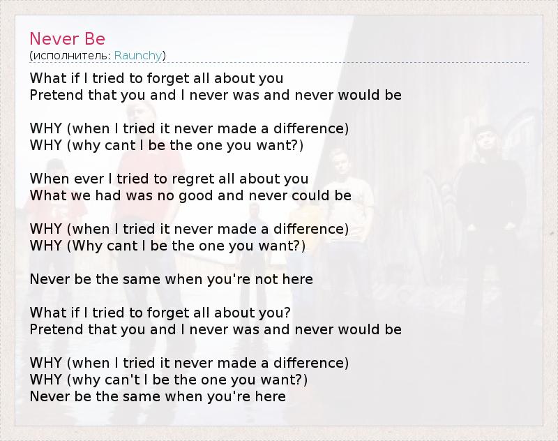What if I tried to forget all about you Pretend that you and I never was and never would be WHY (when I tried it never made a difference) WHY (why cant I be the one you want?) When ever I tried to regret all about you What we had was no good and never could be WHY (when I tried it never made a difference) WHY (Why cant I be the one you want?) Never be the same when you're not here What if I tried to forget all about you? Pretend that you and I never was and never would be WHY (when I tried it never made a difference) WHY (why can't I be the one you want?) Never be the same when you're here
