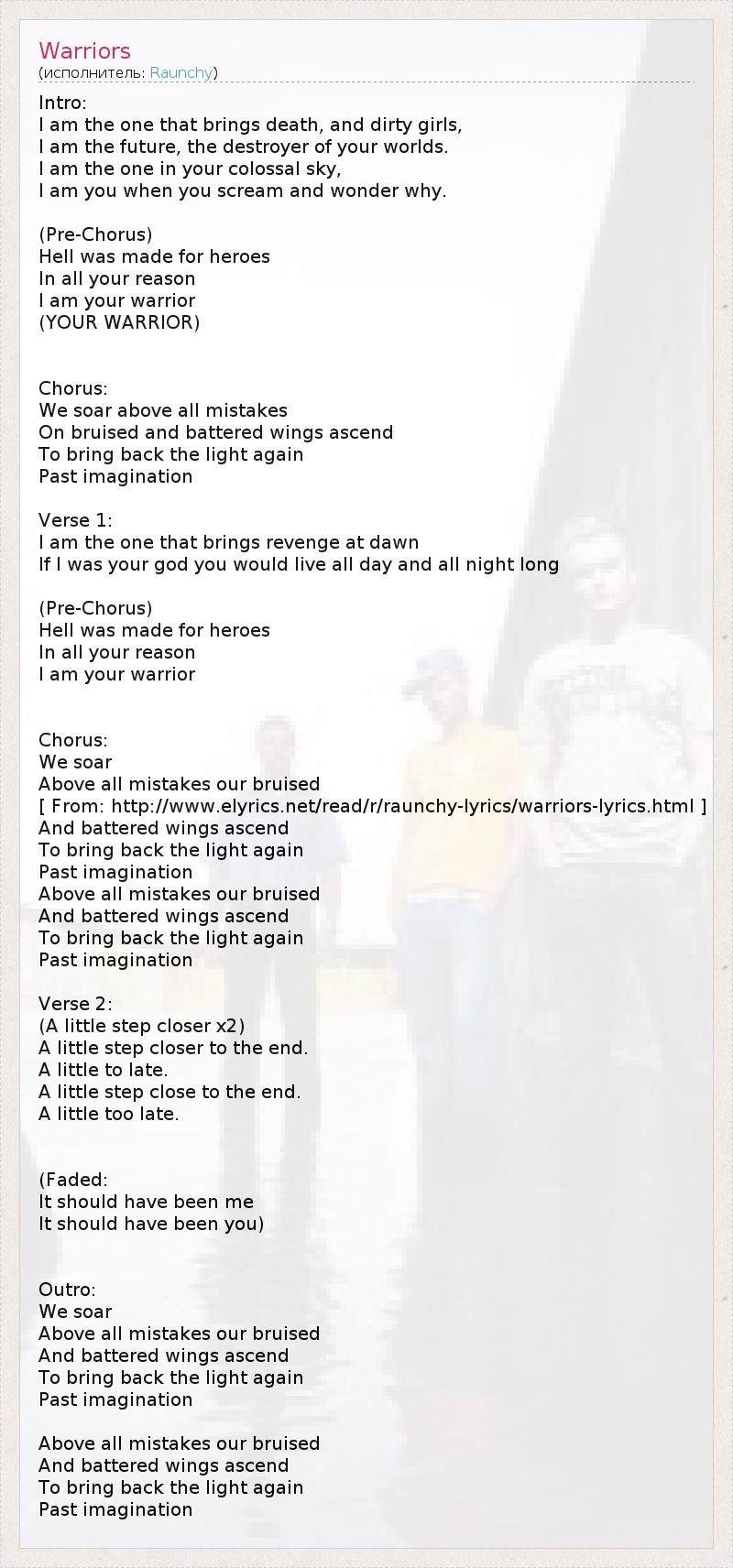 [ From: http://www.elyrics.net/read/r/raunchy-lyrics/warriors-lyrics.html ]