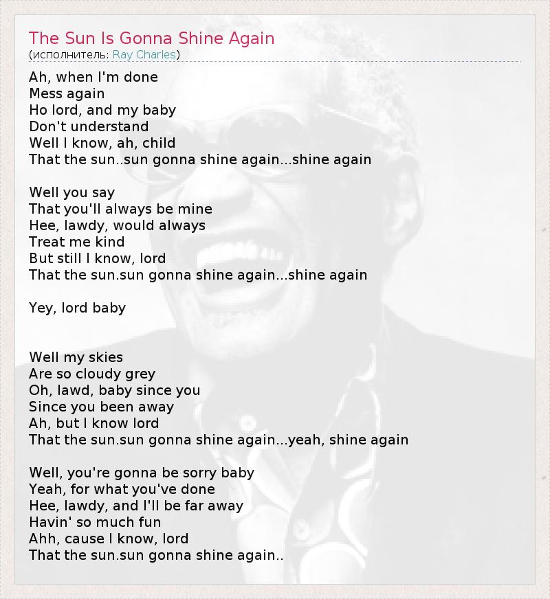 Ah, when I'm done Mess again Ho lord, and my baby Don't understand Well I know, ah, child That the sun..sun gonna shine again...shine again Well you say That you'll always be mine Hee, lawdy, would always Treat me kind But still I know, lord That the sun.sun gonna shine again...shine again Yey, lord baby Well my skies Are so cloudy grey Oh, lawd, baby since you Since you been away Ah, but I know lord That the sun.sun gonna shine again...yeah, shine again Well, you're gonna be sorry baby Yeah, for what you've done Hee, lawdy, and I'll be far away Havin' so much fun Ahh, cause I know, lord That the sun.sun gonna shine again..