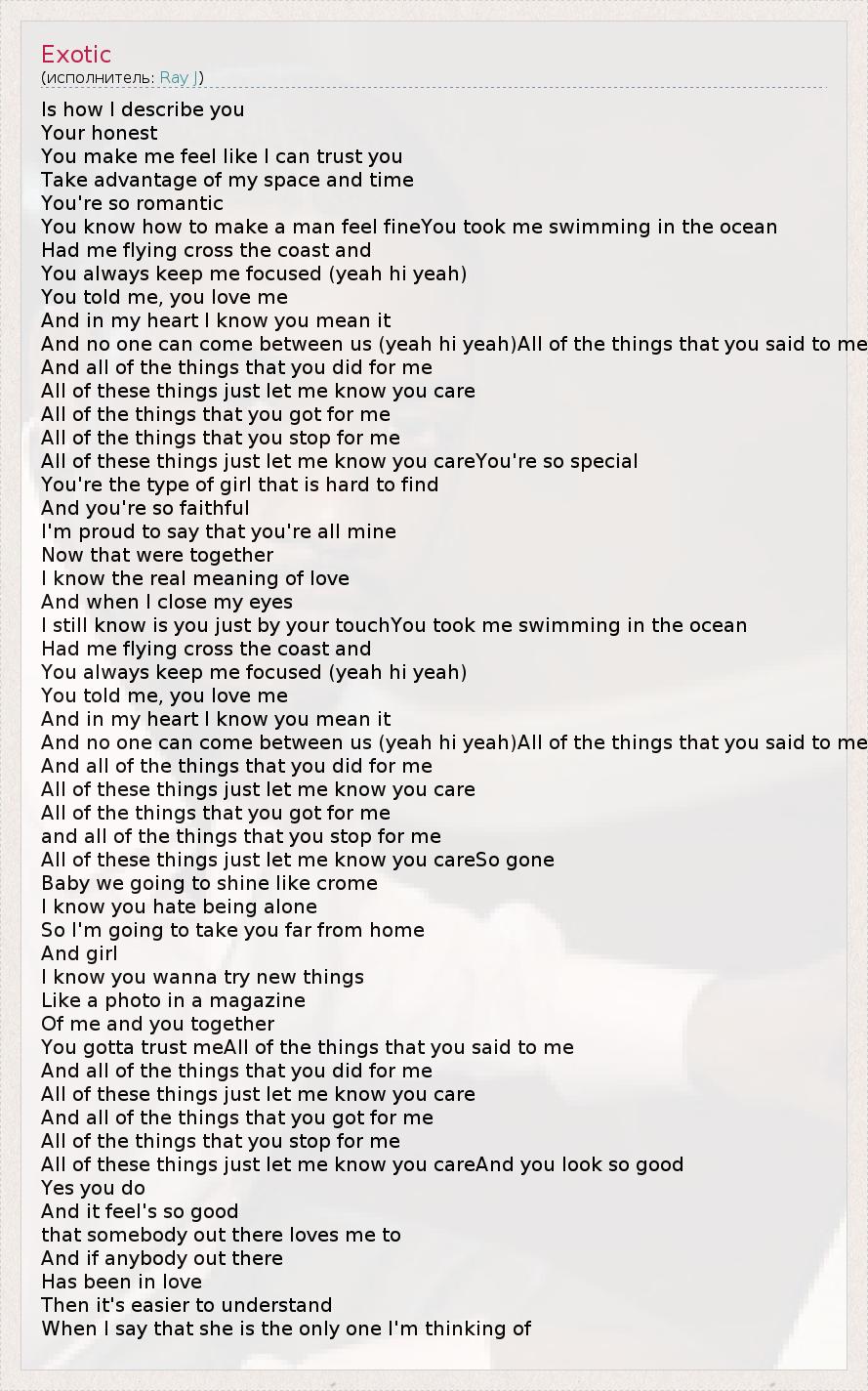 Is how I describe you Your honest You make me feel like I can trust you Take advantage of my space and time You're so romantic You know how to make a man feel fineYou took me swimming in the ocean Had me flying cross the coast and You always keep me focused (yeah hi yeah) You told me, you love me And in my heart I know you mean it And no one can come between us (yeah hi yeah)All of the things that you said to me And all of the things that you did for me All of these things just let me know you care All of the things that you got for me All of the things that you stop for me All of these things just let me know you careYou're so special You're the type of girl that is hard to find And you're so faithful I'm proud to say that you're all mine Now that were together I know the real meaning of love And when I close my eyes I still know is you just by your touchYou took me swimming in the ocean Had me flying cross the coast and You always keep me focused (yeah hi yeah) You told me, you love me And in my heart I know you mean it And no one can come between us (yeah hi yeah)All of the things that you said to me And all of the things that you did for me All of these things just let me know you care All of the things that you got for me and all of the things that you stop for me All of these things just let me know you careSo gone Baby we going to shine like crome I know you hate being alone So I'm going to take you far from home And girl I know you wanna try new things Like a photo in a magazine Of me and you together You gotta trust meAll of the things that you said to me And all of the things that you did for me All of these things just let me know you care And all of the things that you got for me All of the things that you stop for me All of these things just let me know you careAnd you look so good Yes you do And it feel's so good that somebody out there loves me to And if anybody out there Has been in love Then it's easier to understand When I say that she is the only one I'm thinking of