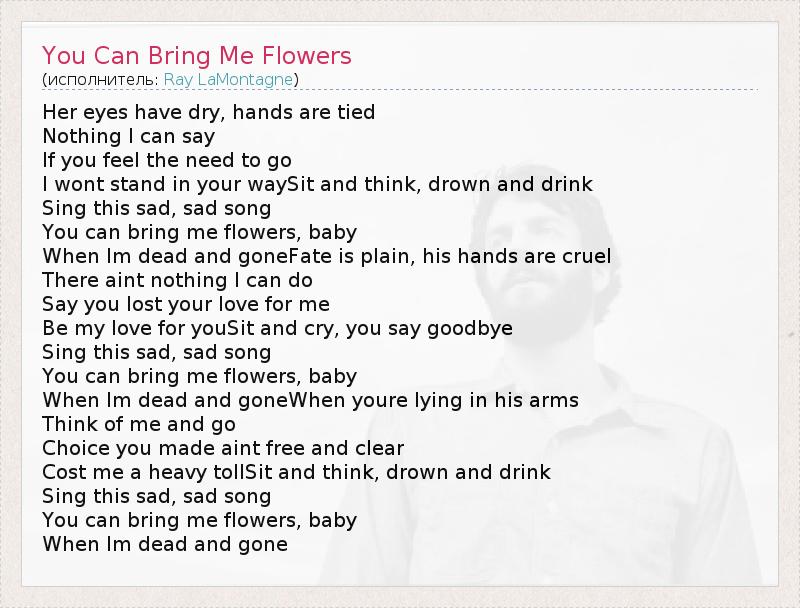 Her eyes have dry, hands are tied Nothing I can say If you feel the need to go I wont stand in your waySit and think, drown and drink Sing this sad, sad song You can bring me flowers, baby When Im dead and goneFate is plain, his hands are cruel There aint nothing I can do Say you lost your love for me Be my love for youSit and cry, you say goodbye Sing this sad, sad song You can bring me flowers, baby When Im dead and goneWhen youre lying in his arms Think of me and go Choice you made aint free and clear Cost me a heavy tollSit and think, drown and drink Sing this sad, sad song You can bring me flowers, baby When Im dead and gone