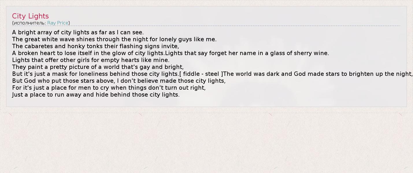 Это интересно:Рэй Прайс (англ. Ray Price; 12 января 1926, Вуд — 16 декабря 2013, Маунт-Плезант, Техас) — американский певец, автор песен и гитарист. В 1996 году внесён в «Зал славы» кантри-музыки. Наиболее известные песни — «Release Me», «Crazy Arms», «For the Good Times», «Danny Boy», «City Lights».