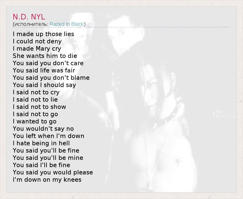 I made up those lies I could not deny I made Mary cry She wants him to die You said you don't care You said life was fair You said you don't blame You said I should say I said not to cry I said not to lie I said not to show I said not to go I wanted to go You wouldn't say no You left when I'm down I hate being in hell You said you'll be fine You said you'll be mine You said I'll be fine You said you would please I'm down on my knees