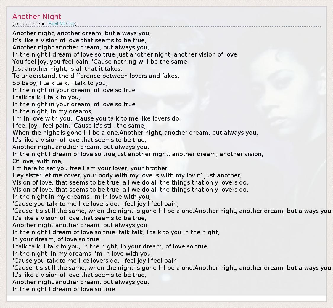 In the night I dream of love so trueJust another night, another dream, another vision,