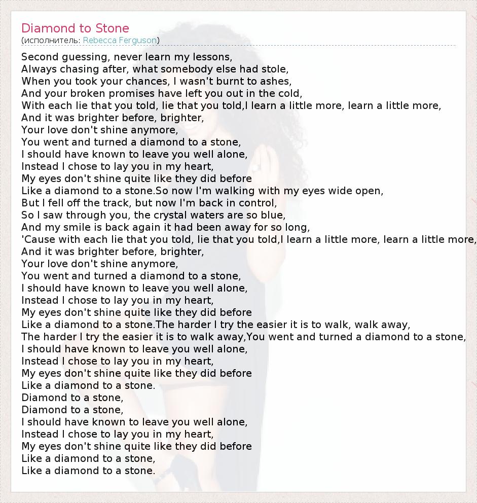 Second guessing, never learn my lessons, Always chasing after, what somebody else had stole, When you took your chances, I wasn't burnt to ashes, And your broken promises have left you out in the cold, With each lie that you told, lie that you told,I learn a little more, learn a little more, And it was brighter before, brighter, Your love don't shine anymore, You went and turned a diamond to a stone, I should have known to leave you well alone, Instead I chose to lay you in my heart, My eyes don't shine quite like they did before Like a diamond to a stone.So now I'm walking with my eyes wide open, But I fell off the track, but now I'm back in control, So I saw through you, the crystal waters are so blue, And my smile is back again it had been away for so long, 'Cause with each lie that you told, lie that you told,I learn a little more, learn a little more, And it was brighter before, brighter, Your love don't shine anymore, You went and turned a diamond to a stone, I should have known to leave you well alone, Instead I chose to lay you in my heart, My eyes don't shine quite like they did before Like a diamond to a stone.The harder I try the easier it is to walk, walk away, The harder I try the easier it is to walk away,You went and turned a diamond to a stone, I should have known to leave you well alone, Instead I chose to lay you in my heart, My eyes don't shine quite like they did before Like a diamond to a stone. Diamond to a stone, Diamond to a stone, I should have known to leave you well alone, Instead I chose to lay you in my heart, My eyes don't shine quite like they did before Like a diamond to a stone, Like a diamond to a stone.