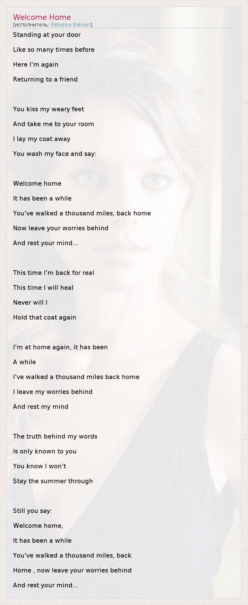 Standing at your door Like so many times before Here I'm again Returning to a friend You kiss my weary feet And take me to your room I lay my coat away You wash my face and say: Welcome home It has been a while You've walked a thousand miles, back home Now leave your worries behind And rest your mind... This time I'm back for real This time I will heal Never will I Hold that coat again I'm at home again, it has been A while I've walked a thousand miles back home I leave my worries behind And rest my mind The truth behind my words Is only known to you You know I won't Stay the summer through Still you say: Welcome home, It has been a while You've walked a thousand miles, back Home , now leave your worries behind And rest your mind...