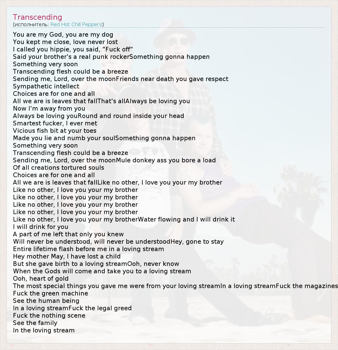 You are my God, you are my dog You kept me close, love never lost I called you hippie, you said, "Fuck off" Said your brother's a real punk rockerSomething gonna happen Something very soon Transcending flesh could be a breeze Sending me, Lord, over the moonFriends near death you gave respect Sympathetic intellect Choices are for one and all All we are is leaves that fallThat's allAlways be loving you Now I'm away from you Always be loving youRound and round inside your head Smartest fucker, I ever met Vicious fish bit at your toes Made you lie and numb your soulSomething gonna happen Something very soon Transcending flesh could be a breeze Sending me, Lord, over the moonMule donkey ass you bore a load Of all creations tortured souls Choices are for one and all All we are is leaves that fallLike no other, I love you your my brother Like no other, I love you your my brother Like no other, I love you your my brother Like no other, I love you your my brother Like no other, I love you your my brother Like no other, I love you your my brotherWater flowing and I will drink it I will drink for you A part of me left that only you knew Will never be understood, will never be understoodHey, gone to stay Entire lifetime flash before me in a loving stream Hey mother May, I have lost a child But she gave birth to a loving streamOoh, never know When the Gods will come and take you to a loving stream Ooh, heart of gold The most special things you gave me were from your loving streamIn a loving streamFuck the magazines Fuck the green machine See the human being In a loving streamFuck the legal greed Fuck the nothing scene See the family In the loving stream