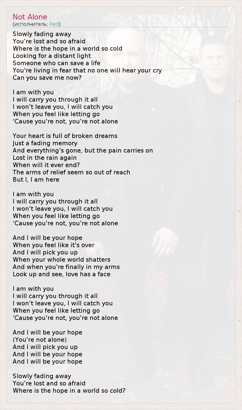 Медленно исчезая, Ты потеряна и так напугана. Где надежда в таком бездушном мире? Пытаясь отыскать далёкий свет, Того, кто может спасти жизнь, Ты живёшь в страхе, что никто не услышит твой крик: "Спасите меня!" Я с тобой, Я проведу тебя через любые невзгоды И никогда тебя не оставлю. Я подхвачу тебя, Когда ты захочешь всё отпустить, Потому что ты не одна, не одна. Твоё сердце полно осколков мечтаний. Воспоминания тускнеют, Всё прошло, но боль осталась. Потерянная, снова стоишь под дождём: "Это когда-нибудь закончится?" Спасительные объятия кажутся чем-то недостижимым, Но я... я здесь... Я с тобой, Я проведу тебя через любые невзгоды И никогда тебя не оставлю. Я подхвачу тебя, Когда ты захочешь всё отпустить, Потому что ты не одна, не одна. Я буду твоей надеждой, Когда тебе будет казаться, что это конец. Я удержу тебя, Если мир уйдёт у тебя из-под ног. А когда ты будешь, наконец, в моих объятиях, Подними глаза - и ты увидишь, что у любви есть лицо... Я с тобой, Я проведу тебя через любые невзгоды И никогда тебя не оставлю. Я подхвачу тебя, Когда ты захочешь всё отпустить, Потому что ты не одна, не одна. Я буду твоей надеждой... (Ты не одна) Я подхвачу тебя... Я буду твоей надеждой... Я буду твоей надеждой... Медленно исчезая, Ты потеряна и так напугана. Где надежда в таком бездушном мире?