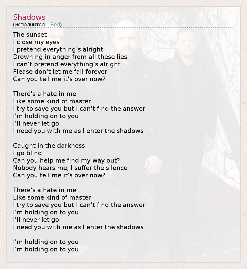 Это интересно:Red — американская рок-группа из Нашвилла, штат Теннесси, образованная в 2004 году и исполняющая песни в стилях христианский рок, альтернативный рок, хард-рок, нью-метал и пост-гранж. На данный момент группа выпустила четыре студийных альбома: End of Silence, Innocence & Instinct, Until We Have Faces и Release the Panic.Команда Red начинала свою карьеру в Пенсильвании, перепевая христианские... продолжение